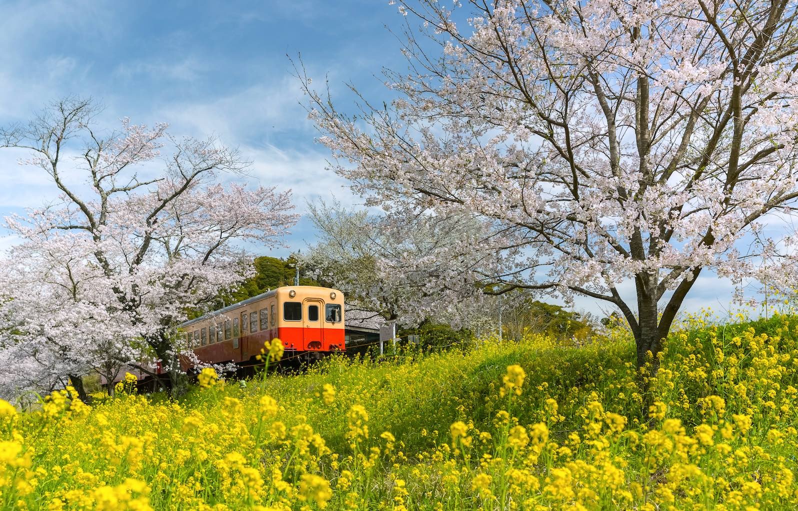 3. Tuyến tàu cổ Kominato (Chiba) – hành trình chiêm ngưỡng sắc hoa xuân rực rỡKominato Railway là tuyến tàu địa phương chạy qua vùng quê thanh bình của tỉnh Chiba. Tuyến tàu này nối thành phố Ichihara với thị trấn Otaki. Hành trình đi trên con tàu chậm rãi lăn bánh giữa những ngôi nhà gỗ mộc mạc, những cánh đồng hoa cải vàng (nanohana) trải dài bất tận và những tán anh đào nở rộ bồng bềnh trong gió xuân.