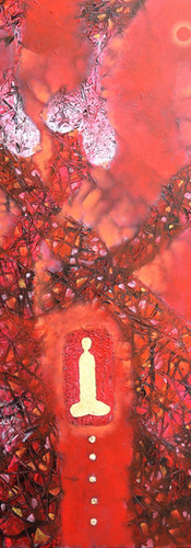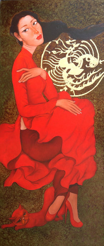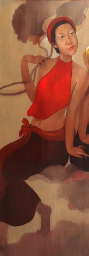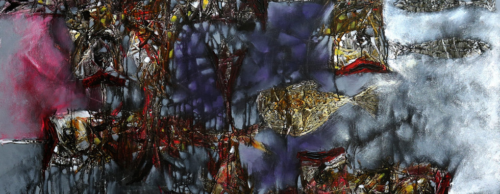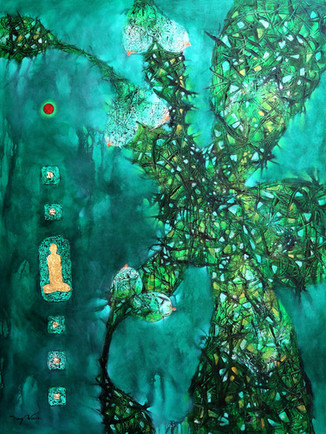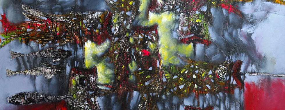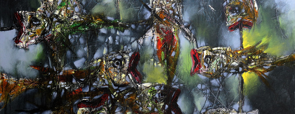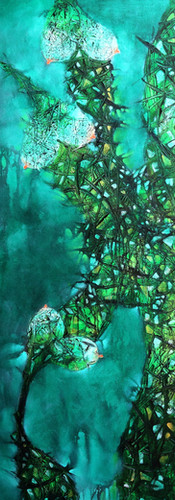 Với Đức Huy, những gam màu bồng bềnh trôi lơ lững và những vệt màu nhuyễn đến tinh nhã cứ ào ạt tuôn chảy, nó không làm mất đi cảm xúc đã được nuôi dưỡng mà ngược lại làm cho dòng xúc cảm đó bám chặt vào ký ức và khắc khoải không nguôi. Những lớp màu sắp xếp đầy chủ ý và được kết nối trên những lớp không gian ẩn hiện đã làm cho tranh của Đức Huy có những nét tương đồng với danh họa Klimt thủa trước của thế kỷ 20, đó là sự liên hệ như một style có tầm ảnh hưởng chứ thực ra anh không tìm lối vẻ mang tính trang trí đậm sắc của Klimt mà qua hình hài của những vật thể mang đậm tính triết lý phương Đông, những con cá đa sắc, những bức tượng Phật, những sợi tơ màu như cái mạng nhện bí ẩn trong chuyện cổ Ba Tư… làm cho tranh của Đức Huy có những tương phản mạnh mẽ nhưng không đối chọi.