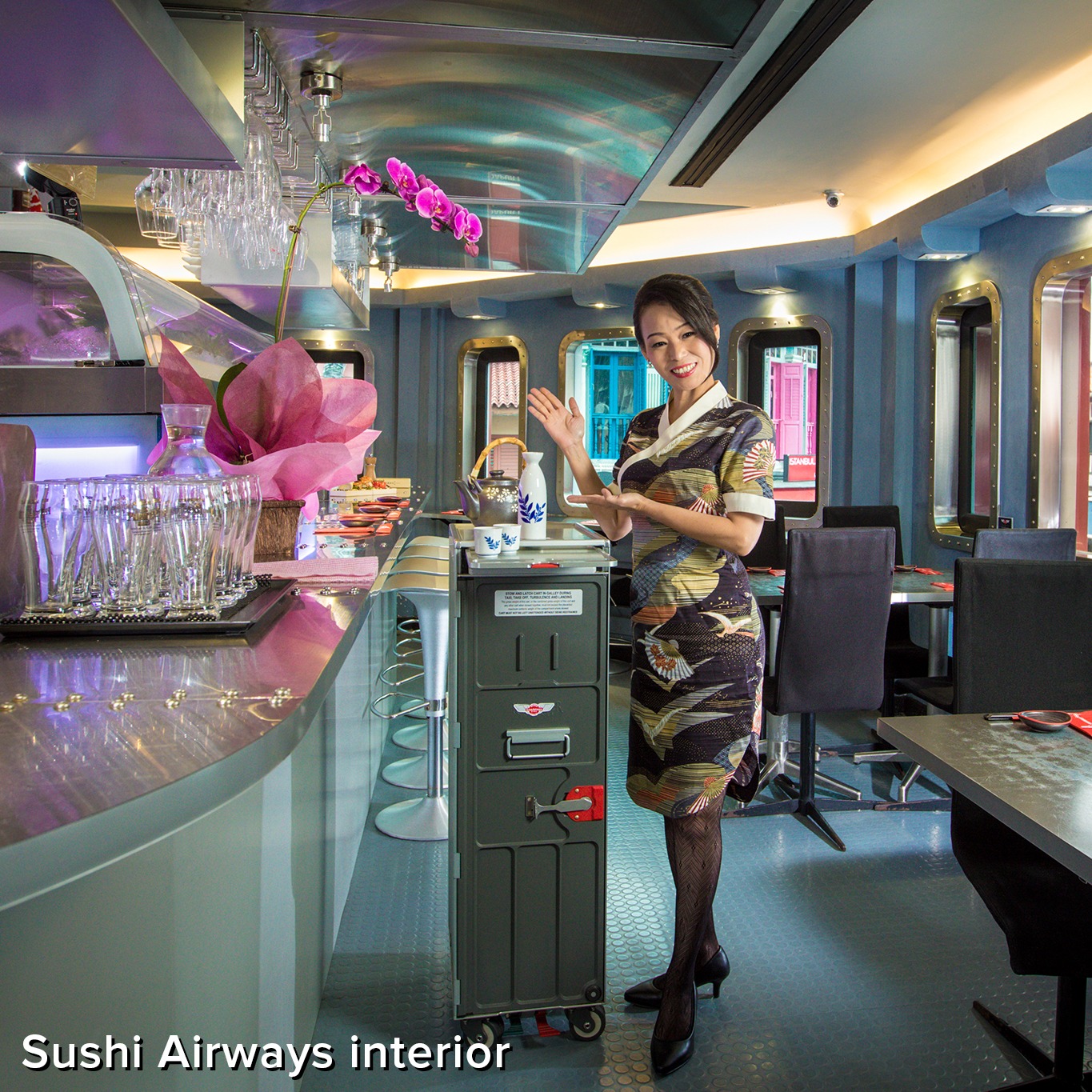 Sushi Airways là một nhà hàng Nhật Bản đặc biệt tọa lạc tại số 20A trên con đường nhộn nhịp Baghdad thuộc khu phố Kampong Gelam. Tại tầng hai của tòa nhà, bạn sẽ được trải nghiệm không gian dùng bữa độc đáo với nội thất tinh xảo lấy cảm hứng từ chiếc máy bay biểu tượng Douglas DC-3.