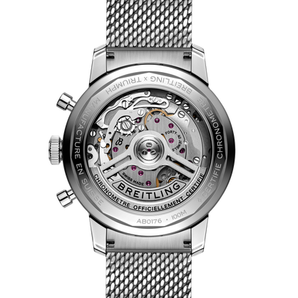 Phiên bản Top Time Triumph của năm nay đã được cải tiến với cỗ máy Caliber 01 do Breitling sản xuất. Sự tinh xảo của cỗ máy nay giờ đã trở nên rõ ràng thông qua thiết kế mặt sau trong suốt mới. Mặt số của chiếc đồng hồ có hai vòng đăng ký, bao gồm một vòng biểu đồ tốc độ đo tốc độ và logo của cả Breitling và Triumph được đặt tại vị trí 12 và 6 giờ. Màu xanh biển độc đáo làm cho nó trở nên rất cuốn hút và bạn có sự lựa chọn giữa dây đeo da bò màu đen thiết kế theo phong cách đua xe hoặc dây đeo bằng kim loại mạch.
