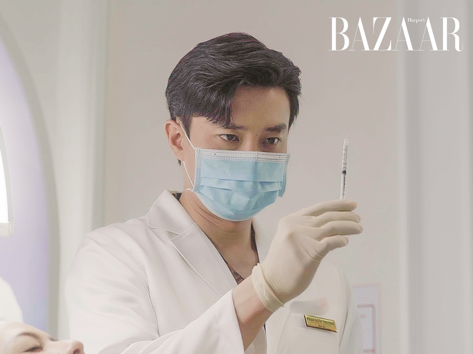 Không chỉ vậy, những chi tiết nhỏ nhưng quan trọng như cách mặc áo blouse, đội nón, đeo găng tay… cũng được anh rèn luyện tỉ mỉ để thể hiện đúng thần thái một bác sĩ thẩm mỹ chuyên nghiệp.