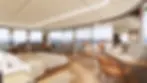 Kết nối không gian bên trong và bên ngoài là nền tảng quan trọng trong ngôn ngữ thiết kế của du thuyền. Theo Custom Line, việc sử dụng rộng rãi kính suốt từ trần đến sàn và các bề mặt phản chiếu được thể hiện rõ ràng trên khắp du thuyền, tạo cảm giác “đang ở trên một hòn đảo được bao quanh bởi nước”.