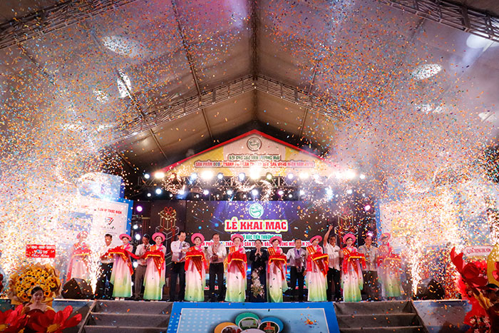 Các đồng chí lãnh đạo thực hiện nghi thức cắt băng khai mạc hội chợ - Ảnh: TL