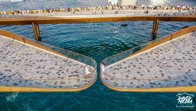 Với tầm nhìn nghệ thuật và ý tưởng độc đáo, ông biến ý niệm về sự kết nối giữa biển trời trở thành một công trình có thật, một công trình vừa mềm mại nhưng cùng vừa vững chãi giữa đại dương. Cây cầu đi bộ trên biển này có tổng chiều dài lên tới 800m, tạo thành hai nhánh cánh cung mềm mại vươn mình ra biển khơi nhưng không chạm vào nhau, mà để hở một khoảng 30cm. Nhịp cách này là nơi tôn vinh sự kết nối, bởi chỉ những cái nắm tay, cái ôm, nụ hôn mới có thể lấp đầy khoảng cách.