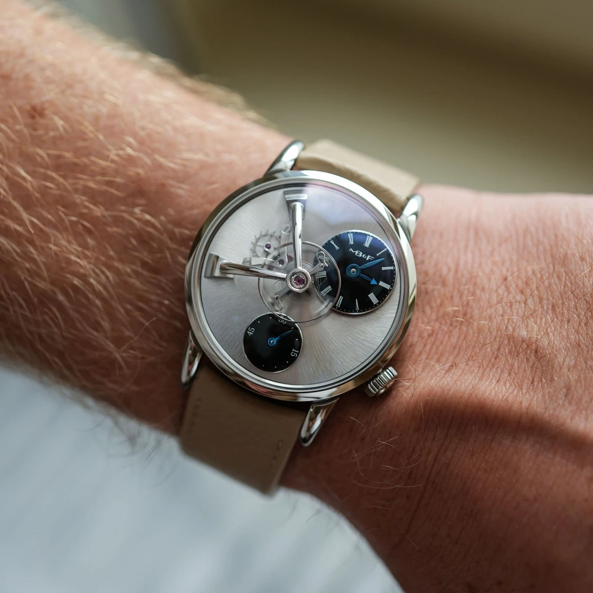 Nhân dịp kỷ niệm 20 năm, MB&F tổ chức chương trình tặng miễn phí 20 chiếc đồng hồ đặc biệt cho cộng đồng thay vì bốc thăm mua như thường lệ. 10 chiếc LM101 Longhorn 20th Anniversary với vỏ thép 40 mm, mặt số phủ rhodium và dòng khắc “Fortune Favours the Bold” sẽ được trao tận tay người thắng tại Geneva. Song song đó, 10 chiếc M.A.D.1S 20th Anniversary, trang bị máy La Joux-Perret G101, hiển thị giờ bằng số La Mã, phối màu bạc-đen-xanh và dây da nâu, sẽ được rút thăm trong danh sách người từng đăng ký M.A.D.Editions. Ảnh: Monochrome Watches.