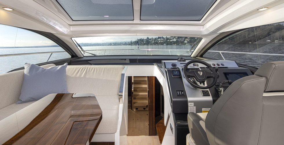 Bên trên là buồng lái kín đáo với mái che bằng điện có thể mở ra để tận hưởng bầu không khí thoáng đãng. Ghế tắm nắng hiện đại nằm ở phía sau đuôi tàu kèm thêm đệm lót trên mũi tàu giúp tăng thêm không gian thư giãn.