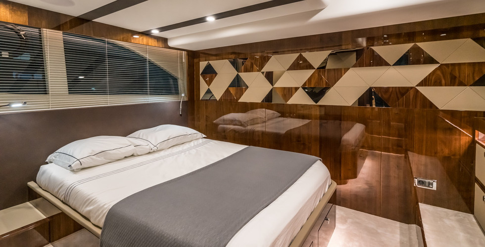 Sau khi tính toán kỹ lưỡng, các nhà thiết kế đã áp dụng tối đa tính linh hoạt trong các khu vực phòng ngủ. Cabin chủ nhân kèm phòng tắm riêng có thể được thay đổi vị trí, ở trung tâm hoặc mũi tàu tùy theo nhu cầu của khách hàng. Cabin khách gồm một giường đôi và một bộ sofa cạnh cửa tạo sự đa dạng trong việc sắp xếp chỗ ngủ và cung cấp đủ không gian thoải mái cho 4 đến 5 hành khách.