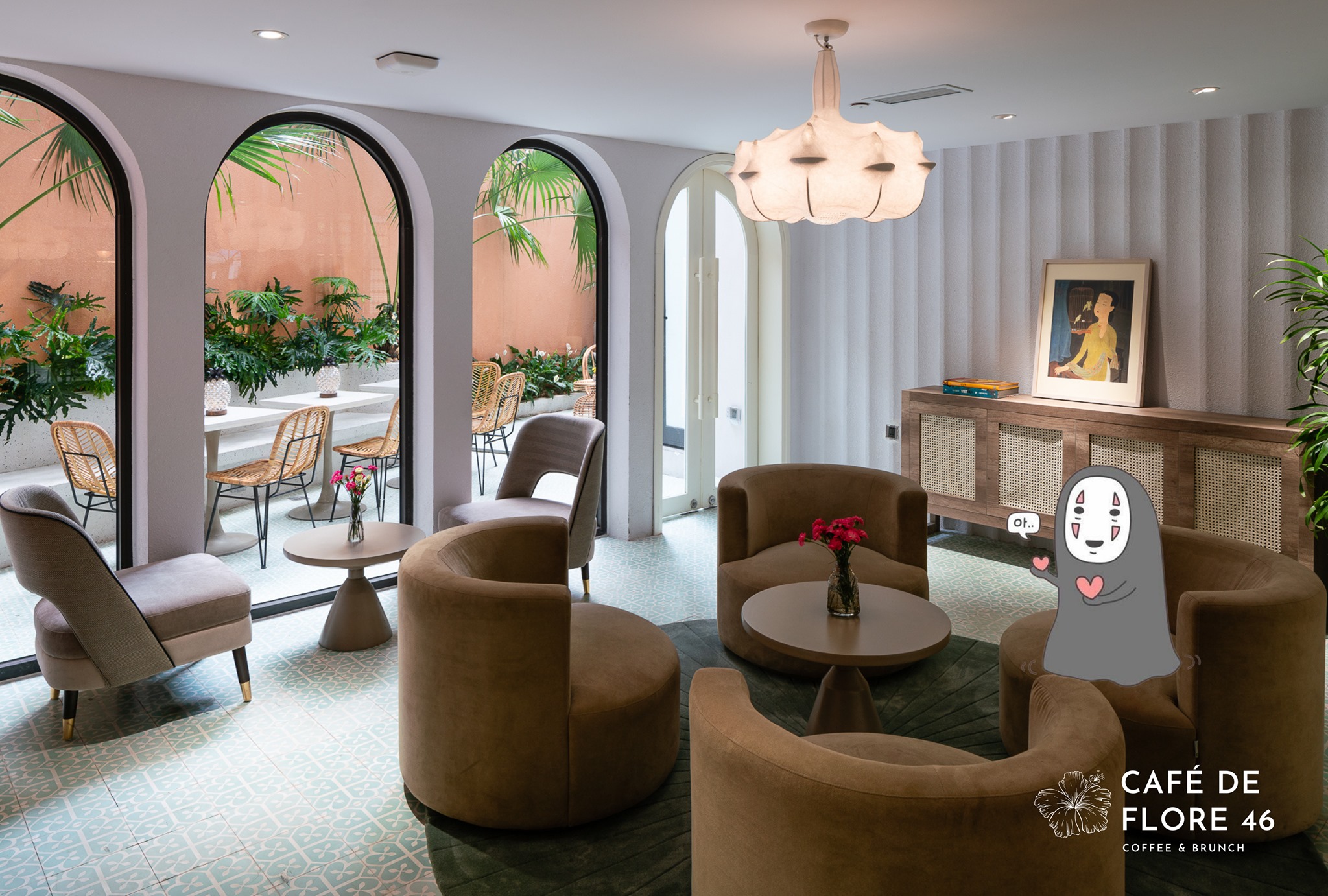 Điểm đặc trưng của quán là các khung cửa hình vòm kết nối không gian bên trong và ngoài quán, giúp đón ánh sáng vừa đủ tạo không khí ấm cúng. Café De Flore decor bằng các màu nóng nên không gian xanh của quán dường như cũng trở nên nổi bật hơn và góp phần tạo ra tổng thể hoàn hảo.