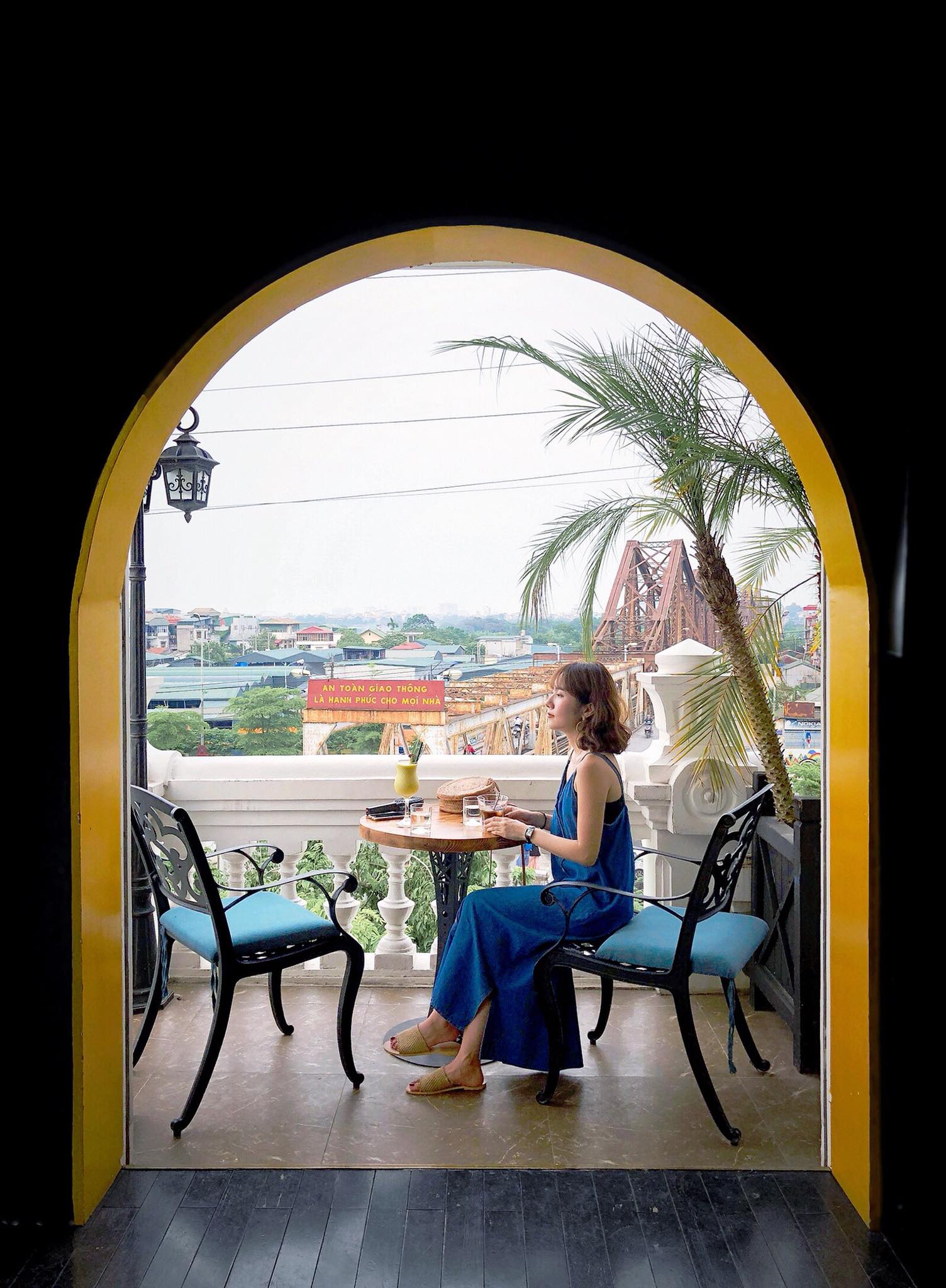 Đặc biệt điểm hút mắt nhất của quán chính là ban công huyền thoại. Thông thường ở các quán cà phê, ban công không quá rộng hoặc tận dụng trang trí triệt để nhưng tại quán lại hướng khách hàng đến khung cảnh bên ngoài, không còn tập trung quá nhiều vào các vật dụng trang trí. Ngồi nơi đây phóng tầm mắt ra xa là toàn cảnh cuộc sống người Hà Nội tất bật bên cây cầu “chứng nhân lịch sử”.