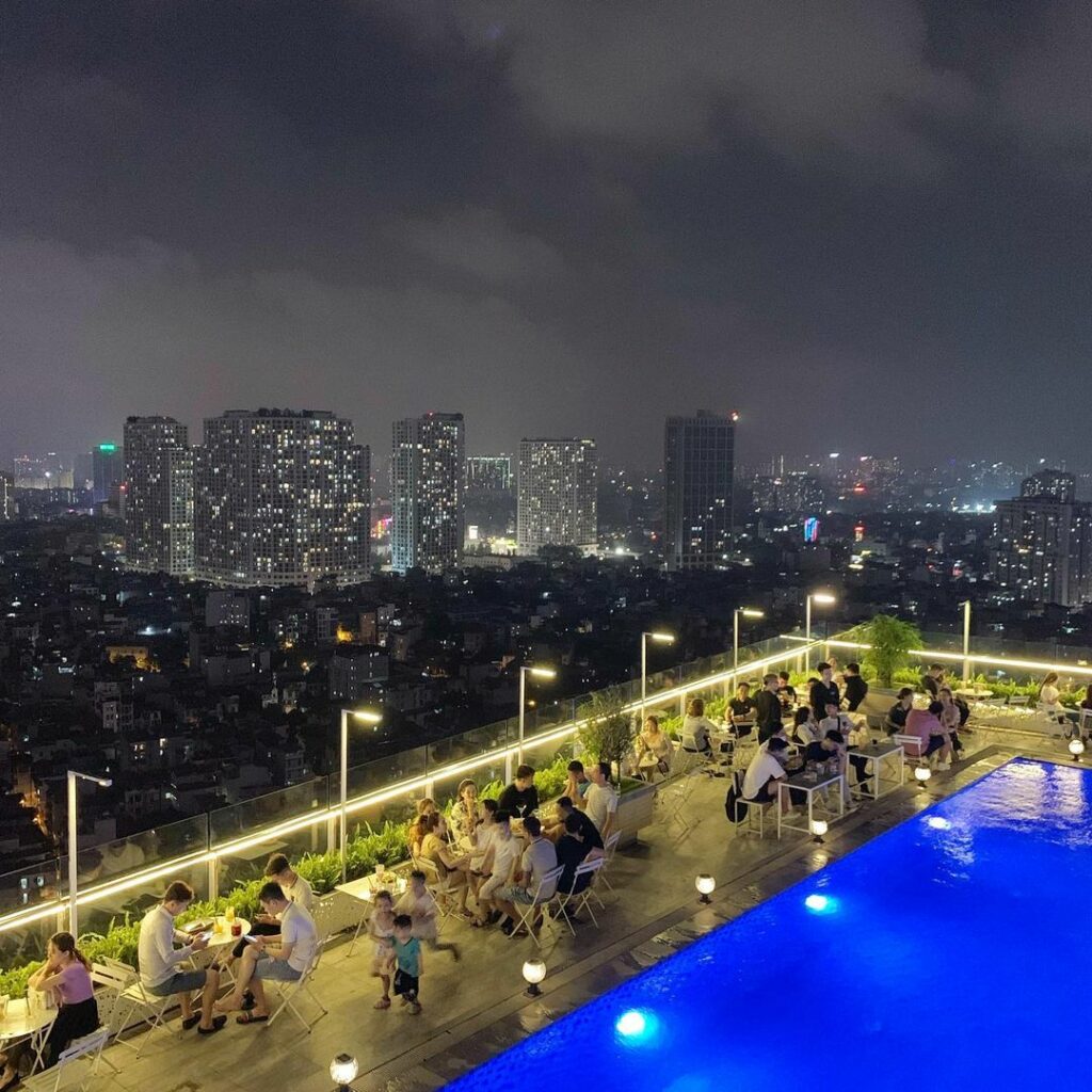 Trill Rooftop Cafe sở hữu view chất lượng “cao” ngắm nhìn Hà Nội theo cả nghĩa đen và nghĩa bóng. Quán lựa chọn phong cách trang trí theo kiểu Bohemian với nhiều bộ bàn ghế bằng gỗ, thảm thổ cẩm và những chiếc gối ôm màu sắc tạo cảm giác phóng khoáng, thoải mái khi ngồi tán gẫu ở đây. Đặc biệt, quán còn sở hữu hồ bơi sang chảnh luôn sẵn sàng để các nàng thả dáng cùng bộ ảnh để đời.