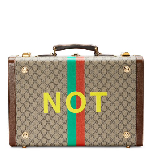 Thiết kế với dòng chữ FAKE/NOT này lại lần nữa xuất hiện trên những chiếc va-li nằm trong bộ sưu tập. Với sản phẩm này, một chi tiết đặc biệt cần phải kể đến đó chính là huy hiệu của hãng được chế tác bởi chất liệu da cao cấp nằm ở mặt trước va-li. Cạnh đó, các sản phẩm khác như túi tote, ba lô, túi đeo hông, túi duffle cỡ vừa và nhỏ, ví, hộp trang điểm... đều sở hữu những nét đặc trưng của bộ sưu tập, đường vạch đỏ-xanh cùng dòng chữ FAKE/NOT màu vàng nằm ở 2 phía.