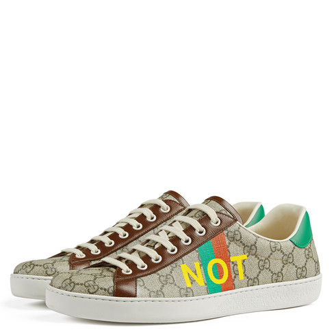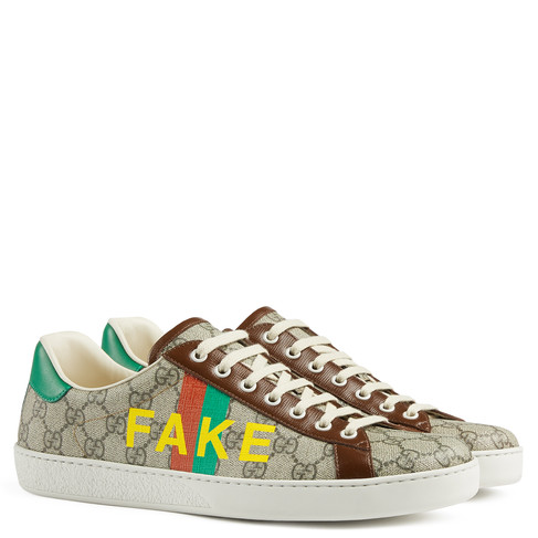 Cuối cùng, thiết kế độc đáo này còn được áp dụng vào cả sản phẩm thời trang phi giới tính, một chiếc giày thể thao dành cho cả nam và nữ. Với sản phẩm trên, logo thương hiệu Gucci sẽ nằm ở phần đuôi giày và 2 dòng chữ FAKE/NOT sẽ nằm ở 2 mặt đối xứng nhau. Một lần nữa vạch màu xanh – đỏ sẽ lại xuất hiện và lần này nó sẽ chạy dọc ở mặt bên thân giày.