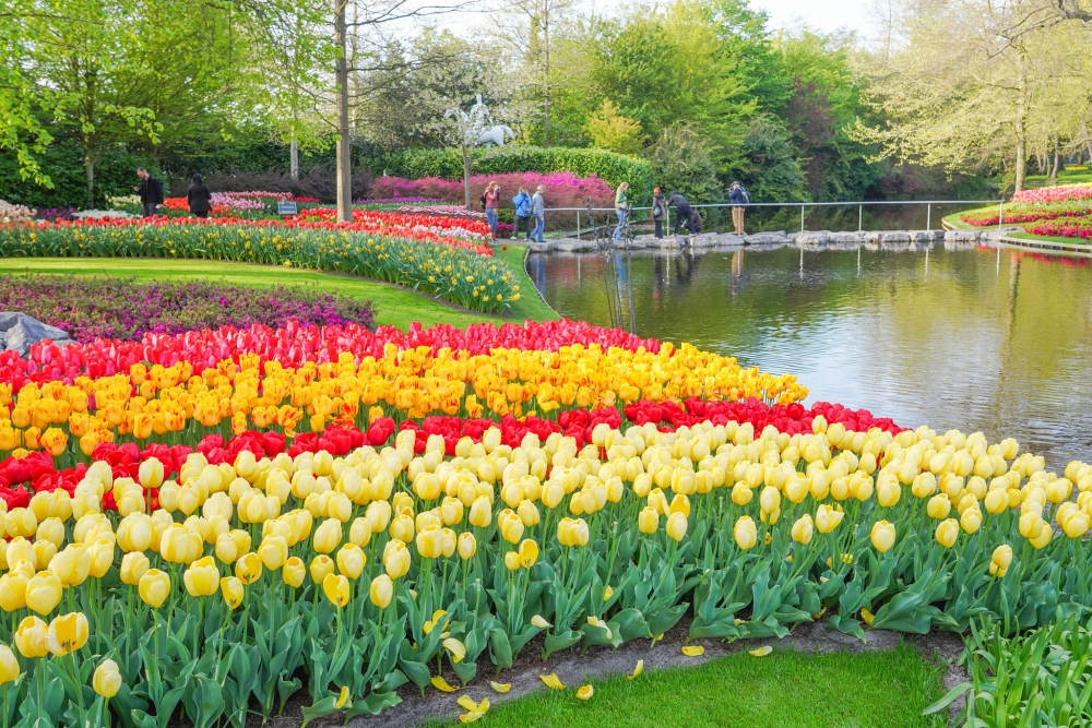 Keukenhof cũng được mệnh danh là “vườn hoa lớn nhất thế giới” hay “vườn hoa mùa xuân đẹp nhất thế giới” với hơn 7 triệu cây hoa từ tulip, thủy tiên, dạ lan hương… đủ màu sắc phủ kín 32 ha diện tích. Luống hoa xếp tầng, xếp lớp mang đến bức tranh sắc màu độc đáo cùng hương thơm vương vấn khắp không gian. Các luống hoa được chăm sóc để đảm bảo hoa nở liên tục trong suốt thời gian công viên mở cửa.