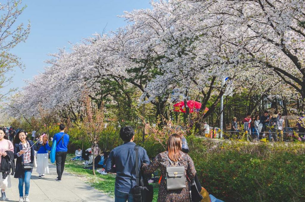 Nếu bạn muốn chiêm ngưỡng những con đường phủ kín màu hồng hoa anh đào, hãy lên kế hoạch du lịch Hàn Quốc vào khoảng cuối tháng 3 đến đầu tháng 4.