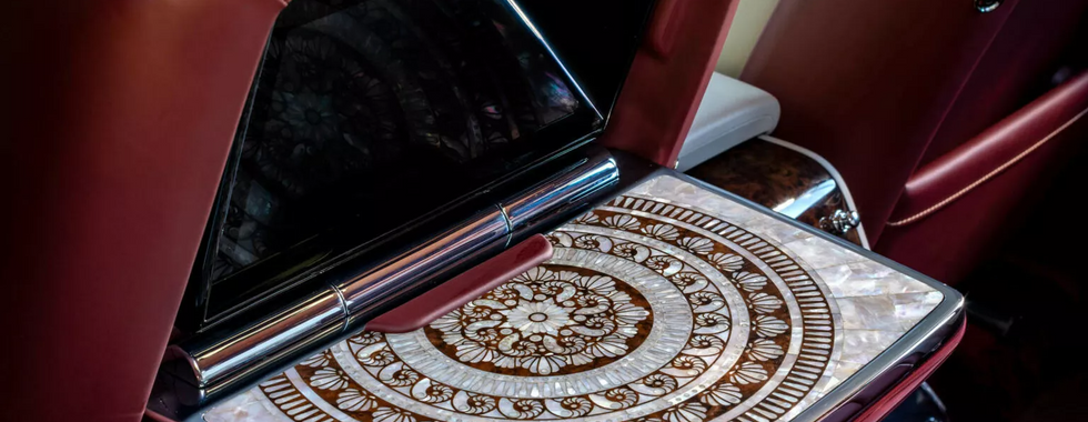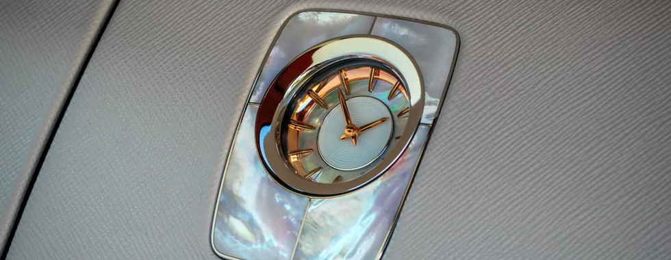 Tấm ốp bằng gỗ óc chó có gờ kết hợp khảm xà cừ tinh xảo lấy cảm hứng từ nghệ thuật truyền thống Trung Đông. Ở vị trí trung tâm là chữ ‘cha’ trong tiếng Ả Rập được khảm bằng thép không gỉ. Lần đầu tiên trên Rolls-Royce, đồng hồ ở bảng điều khiển Bespoke được bao quanh bằng ngọc trai; mặt số và kim đều bằng vàng hồng. Mặt số quay ở giữa cũng được hoàn thiện bằng xà cừ, mang lại chất lượng xúc giác giống như một viên ngọc.