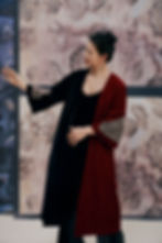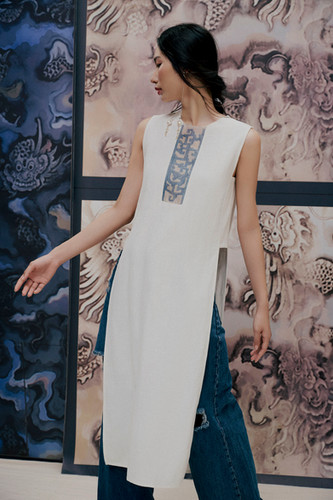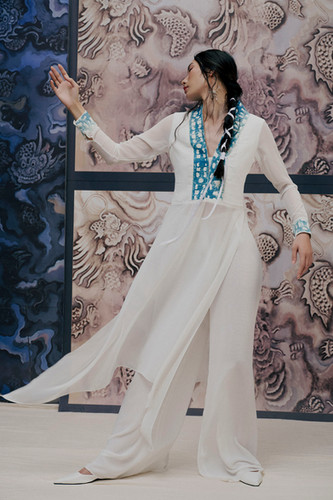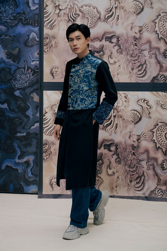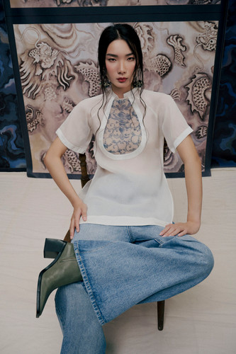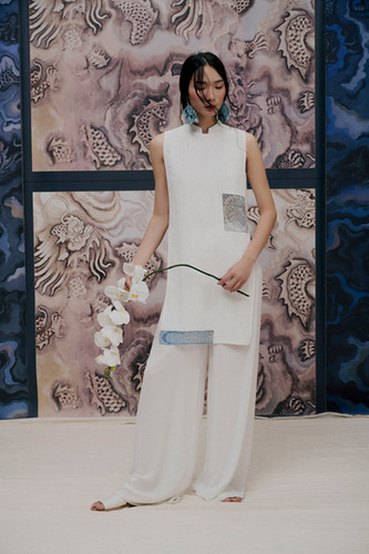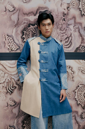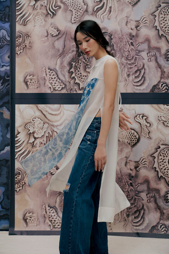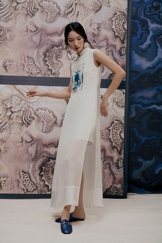 Hành trình ngược dòng, tìm về biểu tượng nguồn cội là hoa văn di sản để khai phá và chạm đến sự đồng nhất tuyệt đẹp giữa ý niệm và biểu hiện, là hướng đi khác biệt tạo nên những hiệu ứng thị giác ấn tượng trong từng tác phẩm. Trên chất liệu lụa trắng óng ả truyền thống của Việt Nam, biểu tượng hoa văn được tạc bởi nền xanh dương “Prussian Blue” hiếm thấy nhờ kỹ thuật cyanotype, mang tới hiệu ứng thị giác đầy mộng ảo, ẩn hiện, gợi không khí huyền hoặc và kỳ bí phương Đông. Dưới tác động của ánh sáng, và trình diễn, tấm lụa in thủ công hoa văn Việt với kỹ thuật cyanotype kinh điển phương Tây mang đến cảm nhận vẻ đẹp tao nhã, tự do như mây trời và khơi dậy tình yêu giá trị văn hoá cội nguồn.
