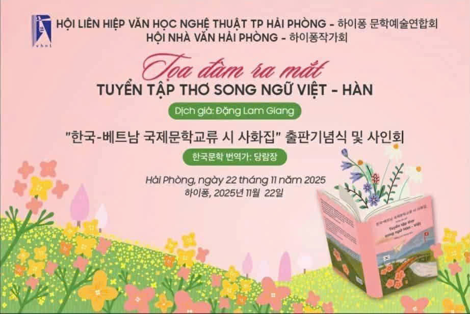 Vào lúc 14 giờ ngày 22 tháng 11 năm 2025, thành phố Cảng Hải Phòng sẽ chào đón một sự kiện văn chương mới: buổi Giao lưu và Ra mắt tập thơ song ngữ Hàn - Việt tại một địa điểm văn hóa của thành phố - trụ sở Hội Liên hiệp VHNT Tp. Hải Phòng. Sự kiện do Hội Liên hiệp VHNT Tp. Hải Phòng và Hội nhà văn Hải Phòng tổ chức, sẽ quy tụ các nhà thơ của cả hai quốc gia, đặc biệt là không thể thiếu những tác giả có tác phẩm được in trong tuyển tập đặc biệt này – để cùng gặp gỡ, trao đổi chuyên môn và chia sẻ về hành trình sáng tạo của mình.