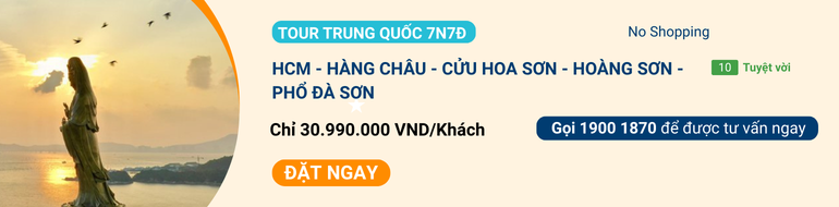 Tour Trung Quốc 7N7Đ nổi bật với hành trình đến Cửu Hoa Sơn và Phổ Đà Sơn, hai trong “Tứ Đại Phật Sơn” cùng với thắng cảnh Hoàng Sơn tuyệt đẹp.