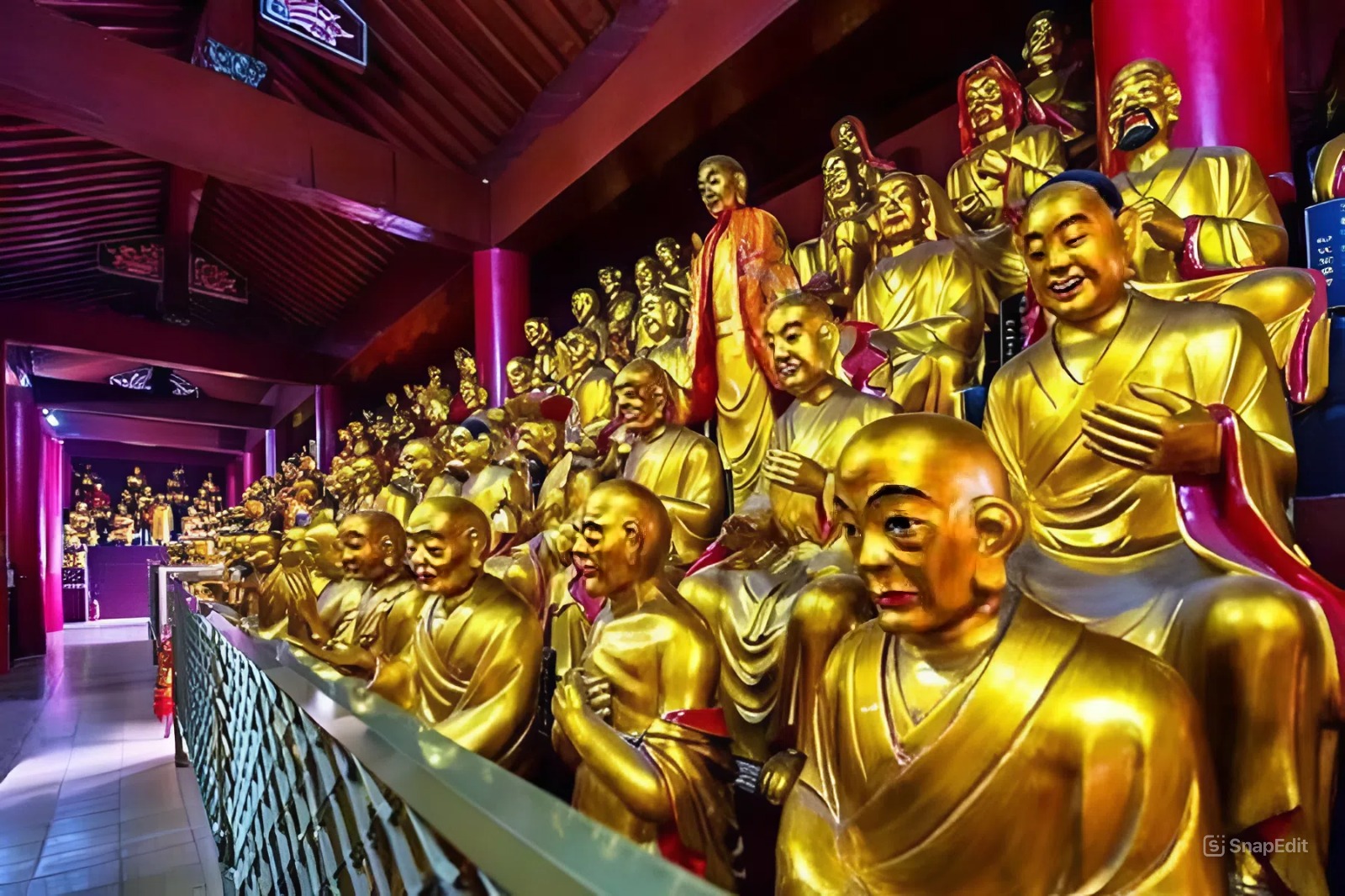 Ngũ Bách La Hán ĐườngNgũ Bách La Hán Đường gây ấn tượng với 500 pho tượng La Hán được tạc với thần thái sinh động. Mỗi bức tượng mang một biểu cảm và tư thế khác nhau. Công trình thể hiện trình độ nghệ thuật điêu khắc tinh xảo.