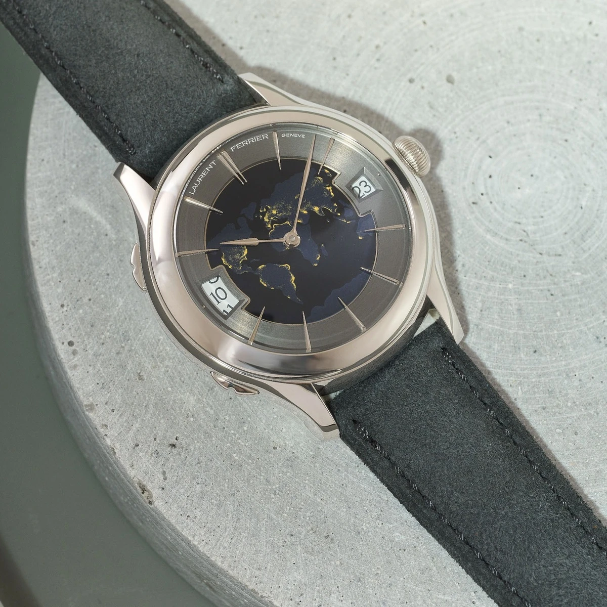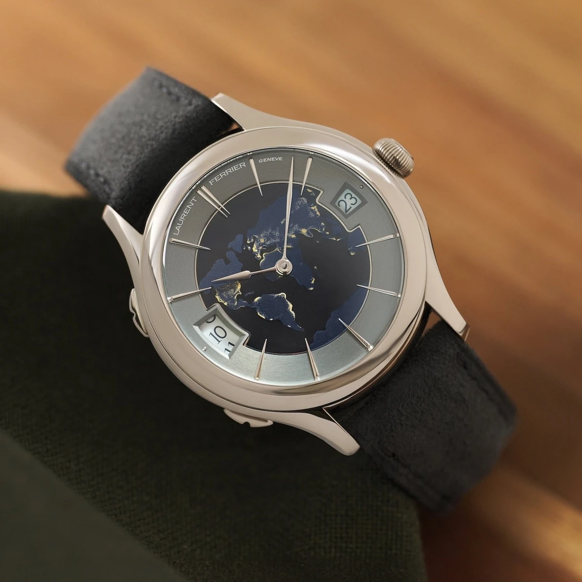 Laurent Ferrier kỷ niệm 15 năm hành trình chinh phục giới chế tác độc lập bằng sáng tạo lấy cảm hứng từ quá khứ, Classic Traveller Globe Night Blue. Phiên bản mới tiếp nối thiết kế giới hạn tại Anh Quốc ra mắt năm 2016, lần này với mặt số champlevé mang hình ảnh địa cầu thu nhỏ. Vòng ngoài mặt số được hoàn thiện bằng kỹ thuật chải satin tròn. Những cọc số giọt nước vươn về phía trung tâm tạo hiệu ứng ba chiều, trong khi kim giờ Assegai bằng vàng trắng đảm nhiệm vai trò hiển thị thời gian. Cỗ máy với bộ vỏ vàng trắng 44 mm có giá 90.000 CHF (khoảng 100.200 USD). Ảnh: Monochrome Watches.