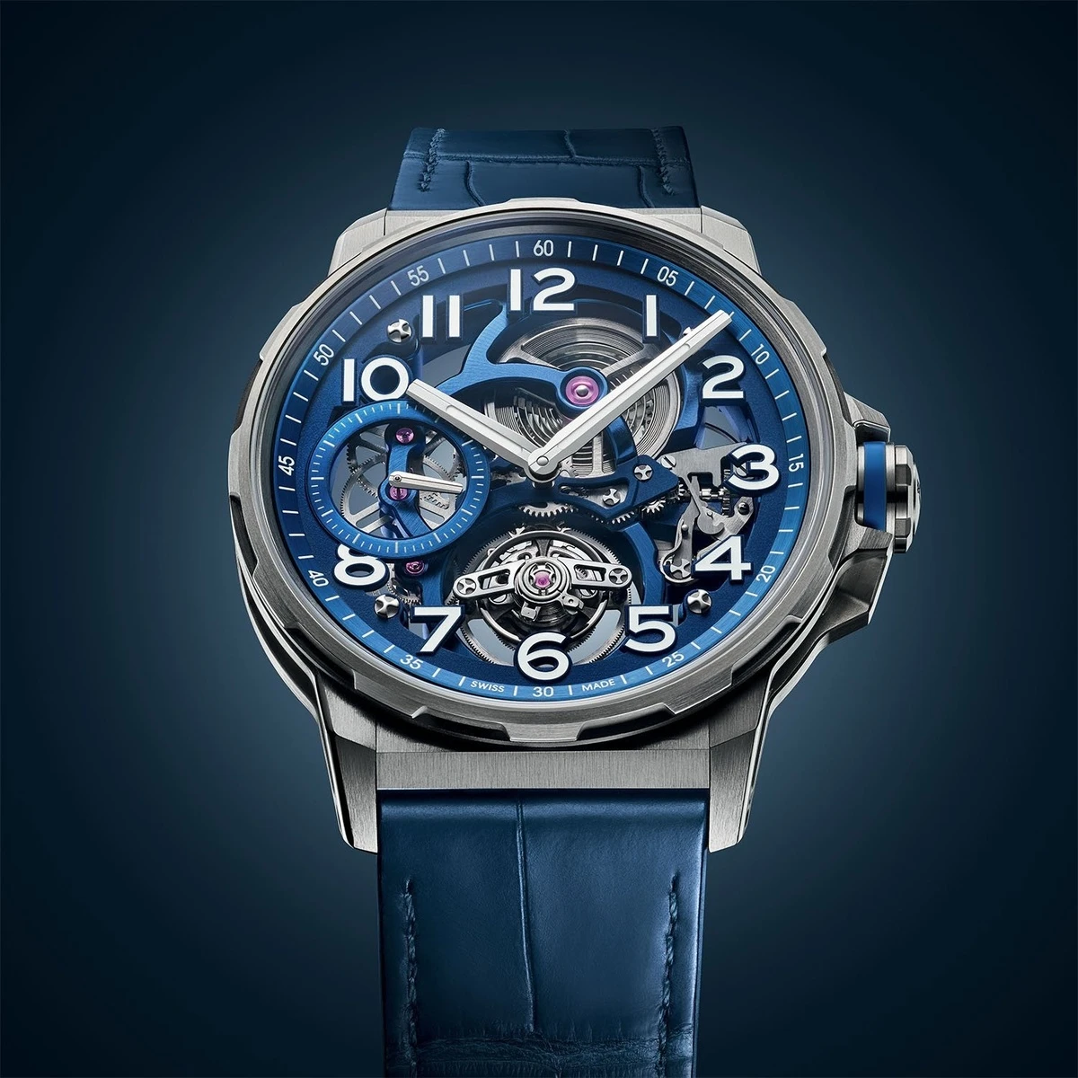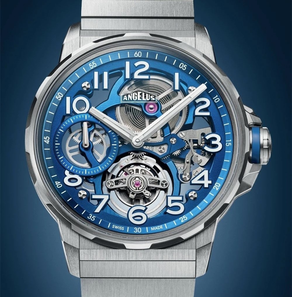 Tuần qua, Angelus trình làng Flying Tourbillon Titanium Blue Edition, bộ sưu tập chronograph mới với điểm nhấn là mặt số skeleton xanh. Mặt số gần như "vô hình", để lộ toàn bộ cấu trúc cầu nối, vòng phút và kim giây nhỏ góc 9 giờ, tất cả đều được phủ PVD xanh tạo hiệu ứng đồng nhất. Những cọc số Arab được đính trên vòng viền bên trong, tạo cảm giác như đang lơ lửng trên bộ máy. Kim và các dấu chỉ giờ đều được phủ dạ quang SLN để đảm bảo độ dễ đọc. Đồng hồ có 2 tùy chọn dây đeo: dây da cá sấu xanh và dây titanium chải xước đơn mắt, giá bán lần lượt 45.000 CHF (khoảng 50.100 USD), 47.000 CHF (khoảng 52.300 USD). Ảnh: Angelus.