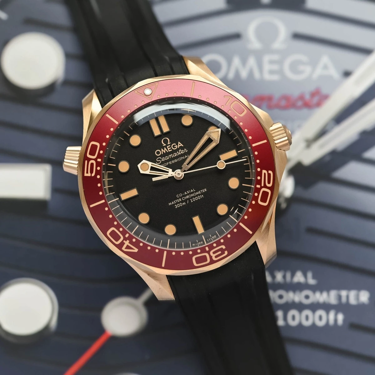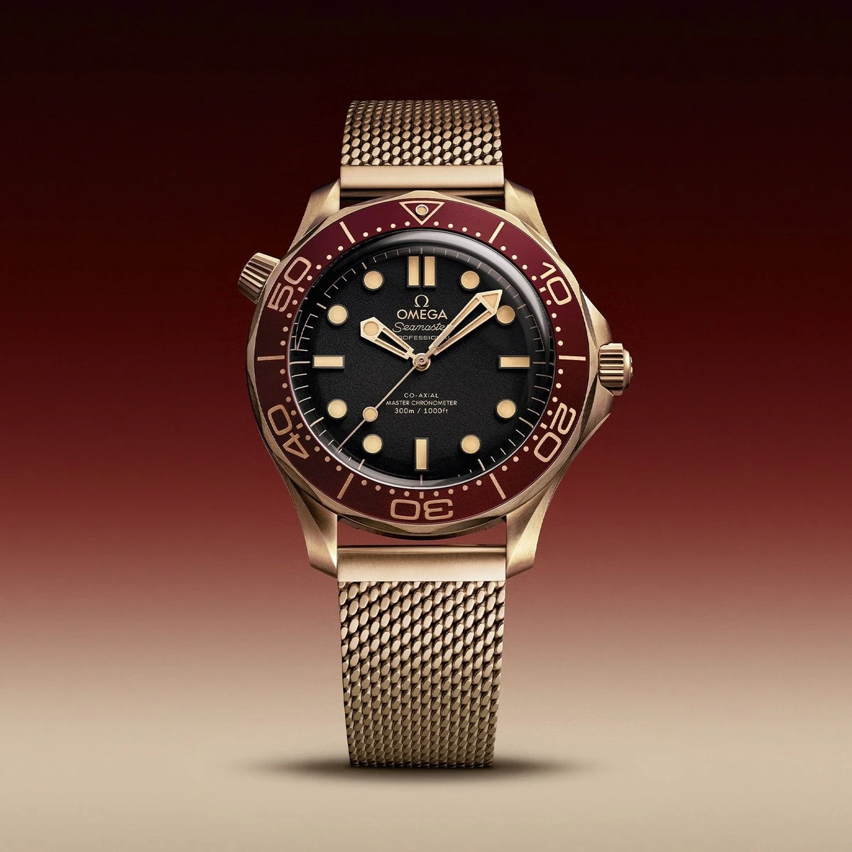 Cổ điển nhưng không kém phần hiện đại, Seamaster Diver 300M Bronze Gold & Burgundy đánh dấu bước đi mới của Omega. Lần này, Seamaster Diver khoác lên lớp vỏ Bronze Gold, hợp kim được Omega phát triển riêng với 37,5% vàng cùng một lượng nhỏ palladium và bạc, mang đến sắc thái ấm nhưng vẫn chống oxy hóa hiệu quả. Về thiết kế, mẫu đồng hồ giữ nguyên ngôn ngữ quen thuộc của dòng Seamaster 300, với bộ vỏ 42 mm, càng nối dây xoắn đặc trưng và vòng bezel răng cưa. Toàn bộ vỏ được hoàn thiện chải mờ và mặt đáy bằng sapphire trong suốt để lộ bộ máy bên trong. Với 2 tuỳ chọn dây đeo cao su đen và lưới bằng đồng vàng, đồng hồ có giá từ 13.900 USD. Ảnh: Monochrome Watches, Omega.