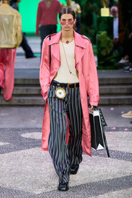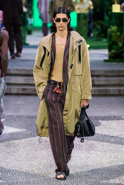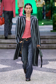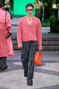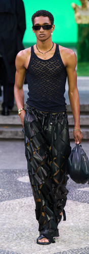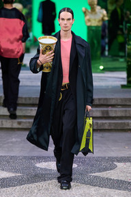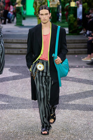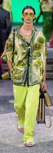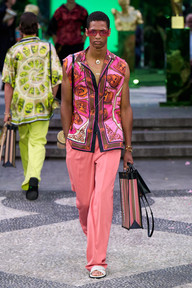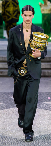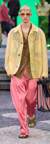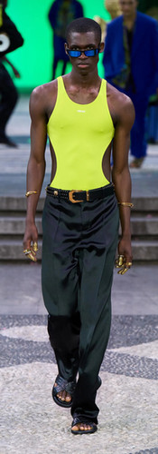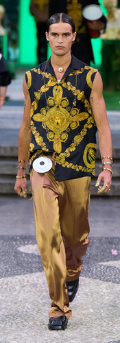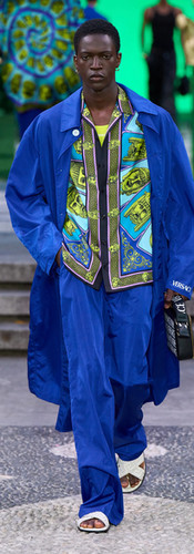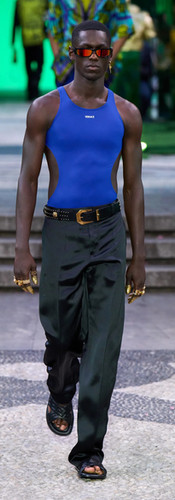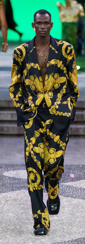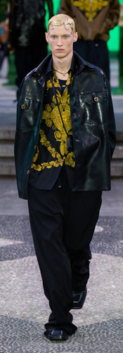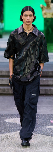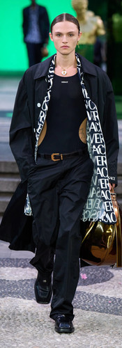 Phom dáng ngoại cỡ tạo cảm giác tự do, phóng khoáng. Trong khi đó, những mẫu áo ôm sát cơ thể lột cả sự quyến rũ của người đàn ông. Những đường cắt hình kim cương biểu tượng của Versace trên quần và áo sơ mi cùng chi tiết cut-out ở hai bên trên những chiếc áo tank-top mang đến diện mạo phá cách và táo bạo cho cánh mày râu. Chất liệu da họa tiết da trăn là một sự lựa chọn thay thế cho da thật. Bên cạnh đó, nhiều mẫu thiết kế làm từ cao su latex thân thiện với môi trường khẳng định tầm nhìn của nhà mốt Ý trong việc từng bước đưa Versace trở thành thương hiệu thời trang bền vững trong tương lai.